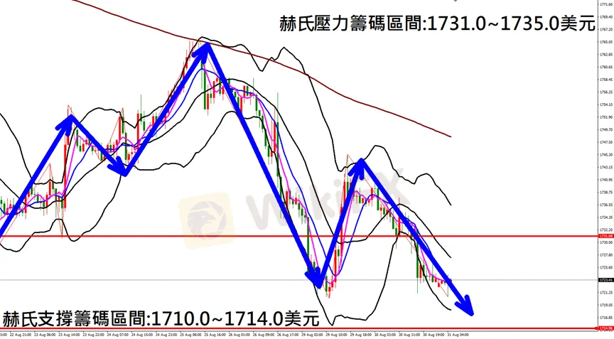 今日黃金(8月31日) 早盤在1722.2附近,從技術分析面切入,1小時級別觀察走勢架構符合昨日(30日)預測K棒出現大跌走勢,空單獲利入袋,同時布林通道開口持續朝下,因此建議佈局空單為主。