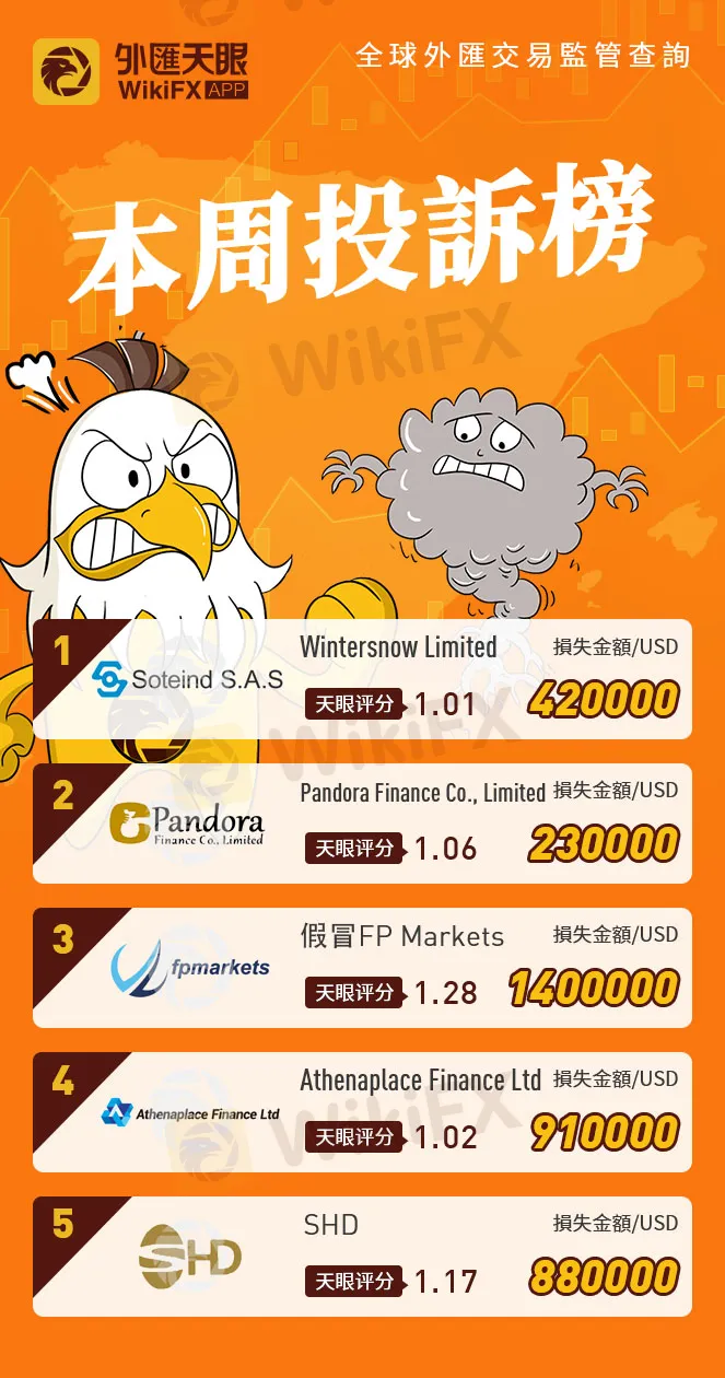 Pandora Finance Co., Limited跟Wintersnow Limited一樣是第一次進入投訴榜。雖然目前只有一位受害者爆料,但在外匯天眼官網上總共可以找到3個同名或類似的平台,其中Pandora Finance則遭到4位投資人投訴。