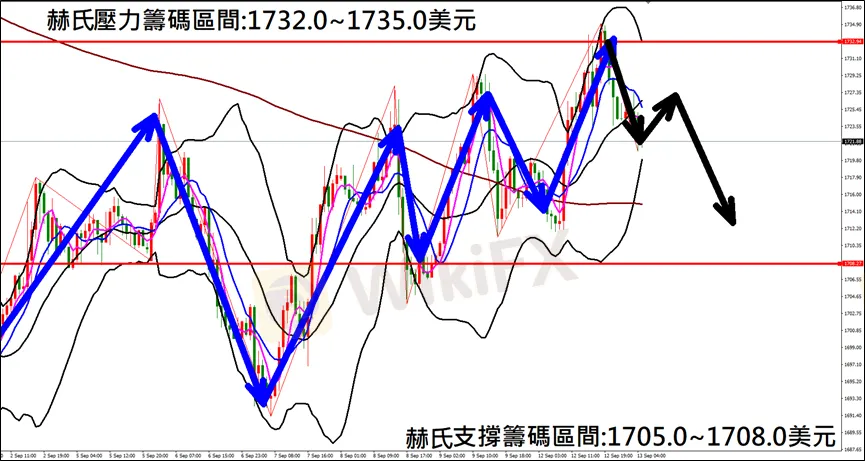 今日黃金(9月13日) 早盤在1724.4附近,從技術分析面切入,1小時級別觀察走勢架構昨日(12日)K棒持續反彈上漲,隨後拉回修正落在中軌下方,有望出現轉折行情,因此建議佈局空單為主。