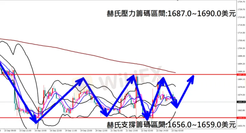 今日黃金(9月23日) 早盤在1671.1附近,從技術分析面切入,1小時級別觀察走勢架構昨日(22日)K棒盤中持續狹幅震盪,目前布林通道開口呈現縮口,有望再度反彈後出現向下修正,因此建議佈局空單為主。
