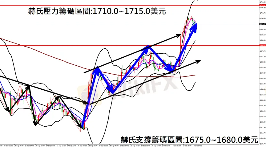 今日黃金(10月4日) 早盤在1699.1附近,從技術分析面切入,1小時級別觀察走勢架構符合昨日(3日)直播預測K棒出現強勢上漲行情,多單獲利入袋,目前K棒短線保持多方浪型,因此建議佈局多單為主。