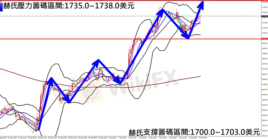 今日黃金(10月6日) 早盤在1715.8附近,從技術分析面切入,1小時級別觀察走勢架構符合昨日(5日)直播預測K棒拉回後再次反彈上漲,目前K棒仍保持多方浪型,因此建議佈局多單為主。