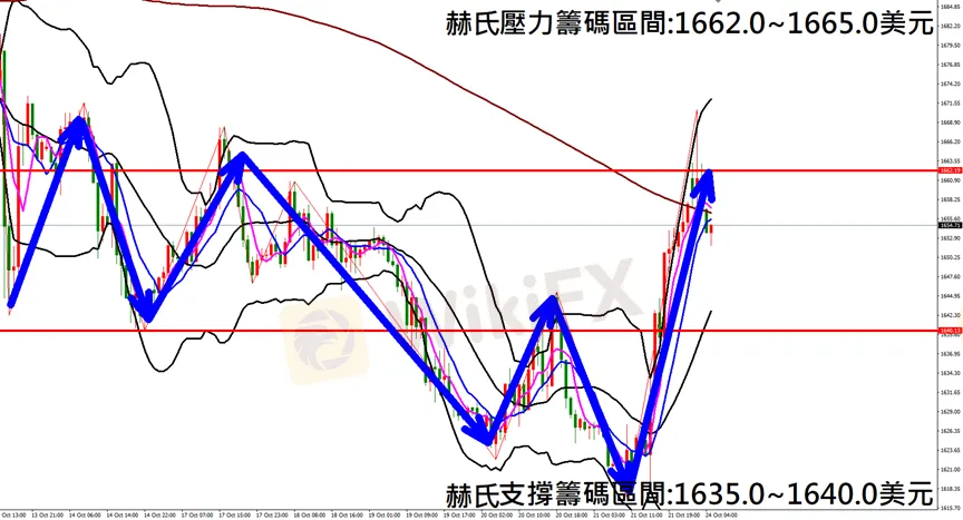 今日黃金(10月24日) 早盤在1661.1附近,從技術分析面切入,1小時級別觀察走勢架構昨日(21日)K棒盤中強勢觸底反彈,一度大漲超過40美元,目前K棒落在240MA均線下方,因此建議佈局空單為主。