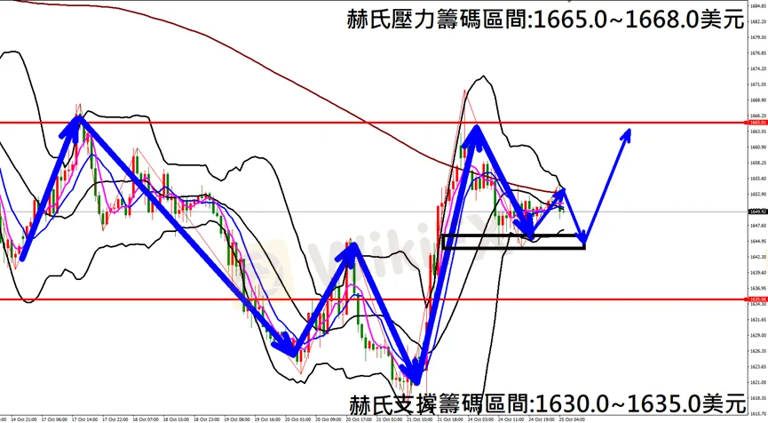 今日黃金(10月25日) 早盤在1649.8附近,從技術分析面切入,1小時級別觀察走勢架構昨日(24日)K棒盤中小幅拉回修正,目前K棒落在中軌附近狹幅震盪,若能站穩中軌則再次反彈,因此建議佈局多單為主。
