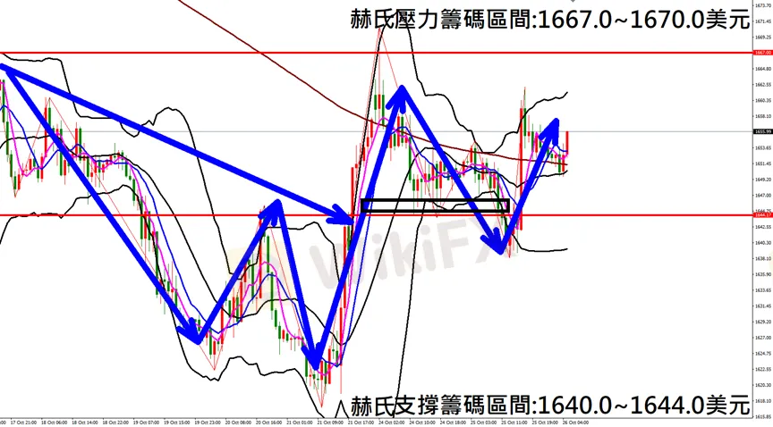 今日黃金(10月26日) 早盤在1652.8附近,從技術分析面切入,1小時級別觀察走勢架構符合昨日(25日)預測K棒盤中出現大漲走勢,多單獲利入袋,目前K棒保持多方排列,因此建議佈局多單為主。