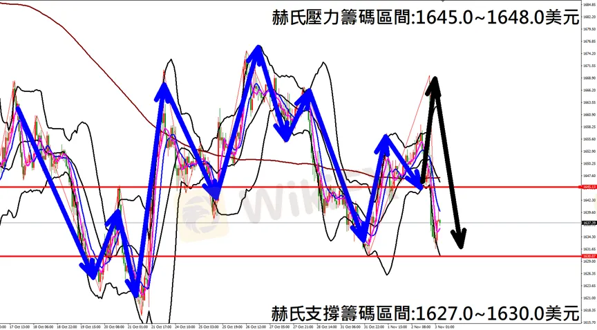 今日黃金(11月3日) 早盤在1633.9附近,從技術分析面切入,1小時級別觀察走勢架構符合昨日(2日)預測K棒盤中先行出現暴漲走勢後出現閃崩行情,目前K棒落在中軌下方,同時形成空方型態,因此建議佈局空單為主。