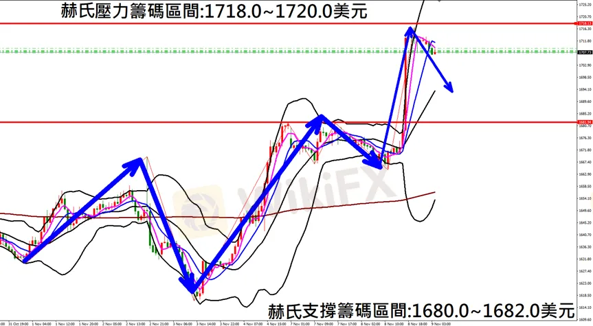 今日黃金(11月9日) 早盤在1710.6附近,從技術分析面切入,1小時級別觀察走勢架構符合昨日(8日)預測K棒盤大幅衝高上漲,多單獲利入袋,目前K棒早盤狹幅震盪,有望拉回修正,因此建議佈局空單為主。