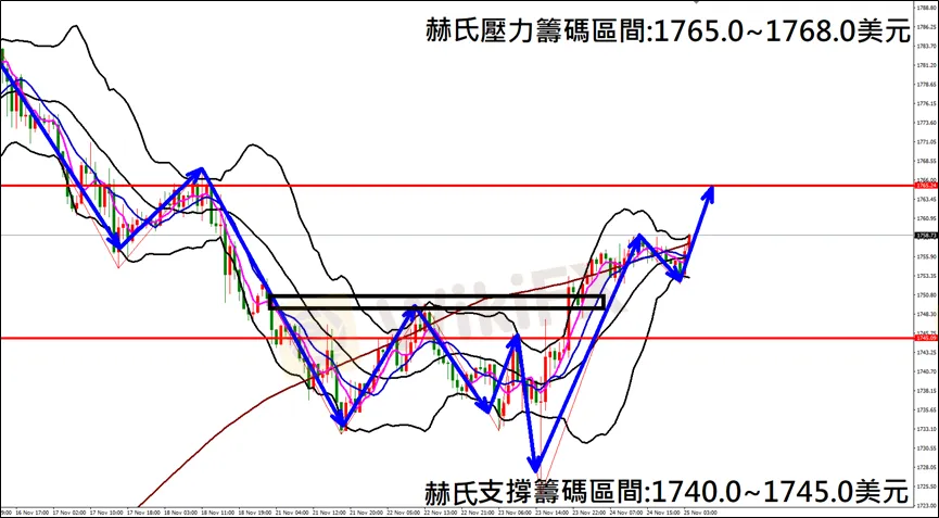 今日(11月25日)黃金 早盤在1754.8附近,從技術分析面切入,1小時級別觀察走勢架構昨日(24日)K棒持續緩步上漲,目前K棒呈現多方排列,有望站穩中軌持續反彈,因此建議偏多為主。