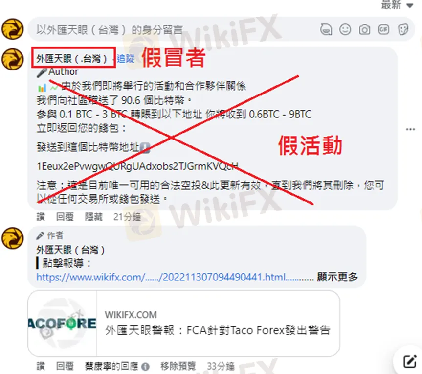 今日,我們發現在外匯天眼臉書粉絲專頁的貼文下方,有個名叫「外匯天眼(.台灣)」的帳號留言,宣稱要進行贈送90.6個比特幣的活動,試圖混淆視聽,利用投資人對外匯天眼的信任,誘導人將比特幣轉帳到來路不明的錢包地址,這是不折不扣的詐騙套路,請大家切勿上當!