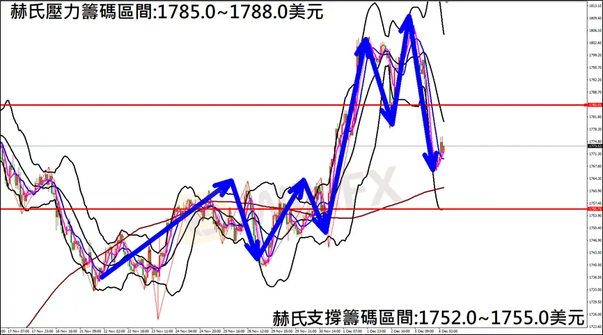 今日(12月6日)黃金 早盤在1767.6附近,從技術分析面切入,1小時級別觀察走勢架構符合昨日(5日)預測K棒出現大跌走勢,空單獲利入袋,目前K棒保持空方型態,同時布林通道開口朝下,因此建議偏空看法為主。