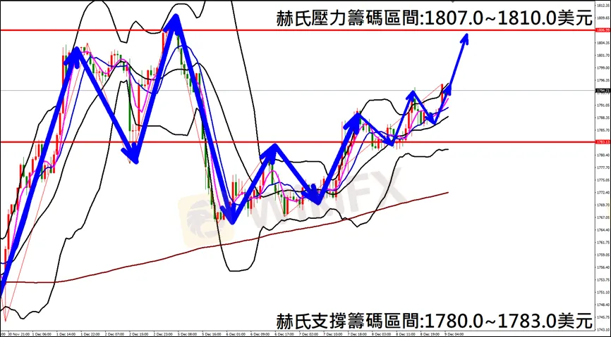 今日(12月9日)黃金 早盤在1788.9附近,從技術分析面切入,1小時級別觀察走勢架構昨日(8日)K棒拉回修正後,再度反彈上漲,目前K棒保持多方型態,同時布林通道開口朝上,因此建議偏多看法為主。