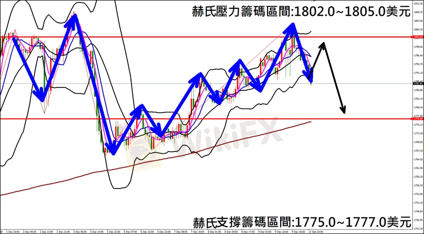 今日(12月12日)黃金 早盤在1796.6附近,從技術分析面切入,1小時級別觀察走勢架構上周五(9日)K棒衝高失敗後拉回修正,目前K棒呈現空方排列,同時布林通道開口轉折朝下,因此建議偏空看法為主。