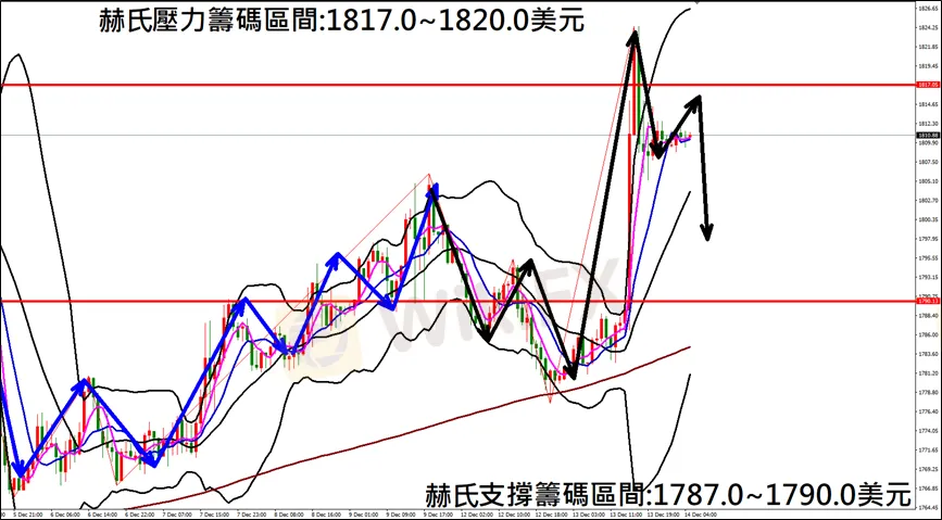 今日(12月14日)黃金早盤在1809.5美元/盎司附近,從技術分析面切入,1小時級別觀察黃金走勢,昨日(13日)K棒爆衝上漲創波段新高,目前K棒高點狹幅震盪拉回修正,若是落在中軌下方有望持續下跌,因此建議外匯市場投資人,今日黃金操作心態以偏空看法為主。