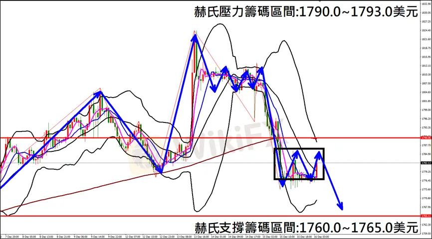今日(12月16日)黃金早盤在1776.4美元/盎司附近,從技術分析面切入,1小時級別觀察黃金走勢,符合昨日(15日)預測K棒出現崩跌走勢,目前K棒落在中軌下方有望持續下跌,因此建議外匯市場投資人,今日黃金操作心態以偏空看法為主。
