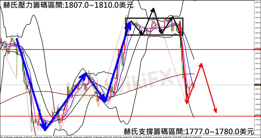 今日(12月23日)黃金早盤在1792.3美元/盎司附近,從技術分析面切入,1小時級別觀察黃金走勢,昨日(22日)K棒高點震盪後出現大跌走勢,目前K棒跌深反彈,有望反彈後再度下跌,因此建議外匯市場投資人,今日黃金操作心態以偏空看法為主。