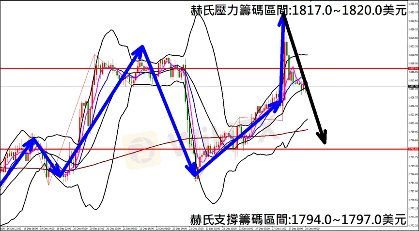 今日(12月28日)黃金早盤在1812.8美元/盎司附近,從技術分析面切入,1小時級別觀察黃金走勢,符合昨日(27日)預測K棒出現噴發大漲走勢,多單獲利入袋,隨即大幅下跌,目前K棒轉為空方排列,因此建議外匯市場投資人,今日黃金操作心態以偏空看法為主。