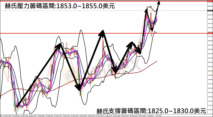 今日(1月4日)黃金早盤在1838.7美元/盎司附近,從技術分析面切入,1小時級別觀察黃金走勢,符合昨日(3日)預測K棒再度上漲,多單再次獲利入袋,目前K棒衝高後狹幅震盪,若跌破下方布林通道中軌支撐後,有望出現大幅下跌行情,因此建議外匯市場投資人,今日黃金操作心態以偏空看法為主。
