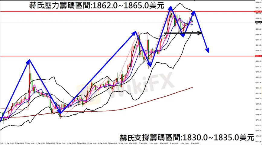 今日(1月5日)黃金早盤在1853.9美元/盎司附近,從技術分析面切入,1小時級別觀察黃金走勢,昨日(4日)K棒上漲後狹幅震盪,目前K棒拉回落在布林通道附近,有望跌破中軌後出現下跌行情,因此建議外匯市場投資人,今日黃金操作心態以偏空看法為主。