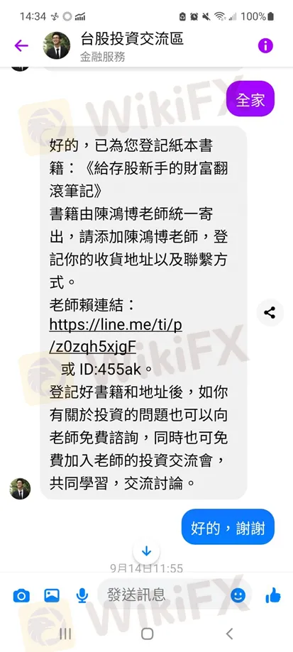 根據這位投資人的分享,她是在臉書上看到一則廣告,聲稱只要將一位「陳鴻博」老師加為LINE好友,就可以獲贈一本財經書籍。她認為這不過是舉手之勞,沒想太多就加了對方,之後確實有成功領到書,也加入了一個投資群組。