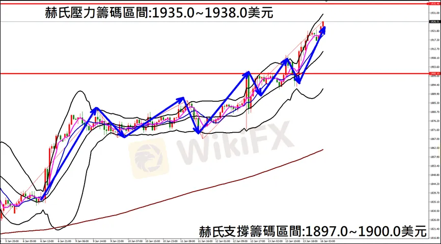 今日(1月16日)黃金早盤在1918.7美元/盎司附近,從技術分析面切入,1小時級別觀察黃金走勢,符合上週五(13日)預測K棒持續反彈上漲,多單再次獲利入袋,目前K棒保持多方排列,因此建議外匯市場投資人,今日黃金操作心態以偏多看法為主。