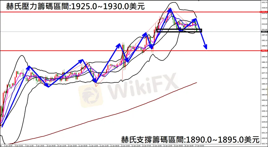 今日(1月17日)黃金早盤在1914.6美元/盎司附近,從技術分析面切入,1小時級別觀察黃金走勢,昨日(16日)K棒高點狹幅震盪,目前K棒轉為空方排列,因此建議外匯市場投資人,今日黃金操作心態以偏空看法為主。