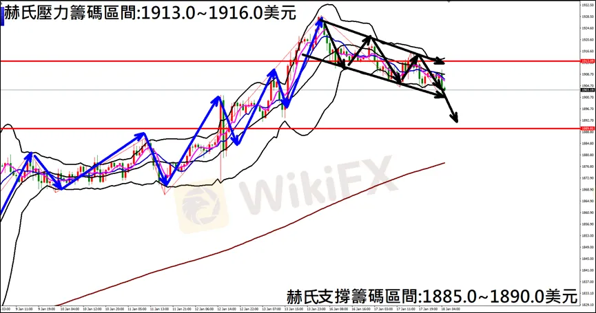 今日(1月18日)黃金早盤在1908.2美元/盎司附近,從技術分析面切入,1小時級別觀察黃金走勢,符合昨日(17日)預測K棒向下修正,空單獲利入袋,目前K棒保持下降通道,因此建議外匯市場投資人,今日黃金操作心態以偏空看法為主。