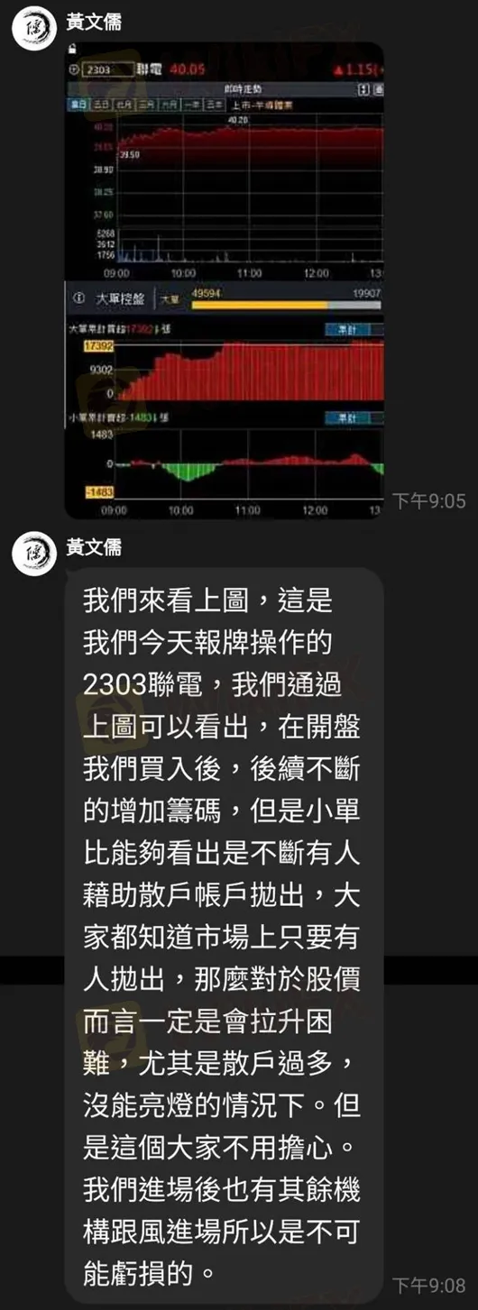 之後,他在女投顧的介紹下,又加入一個大約有60人的投資群組。群組主要是由一位「黃文儒」老師提供個股資訊分析,其他成員則會分享自己跟單炒股大賺的訊息,讓受害者看了相當羨慕。