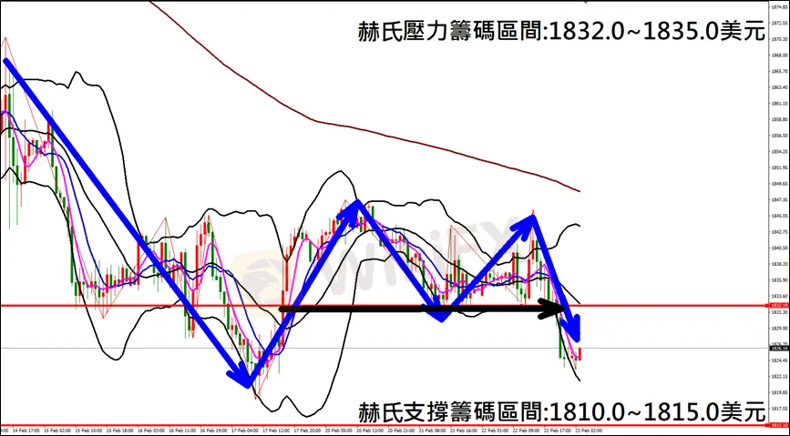 今日(2月23日)黃金早盤在1824.8美元/盎司附近,從技術分析面切入,1小時級別觀察黃金走勢,昨日(22日)K棒反彈遇壓後重挫下跌,空單獲利入袋,目前K棒保持空方排列,因此建議外匯市場投資人,今日黃金操作心態以偏空看法為主。