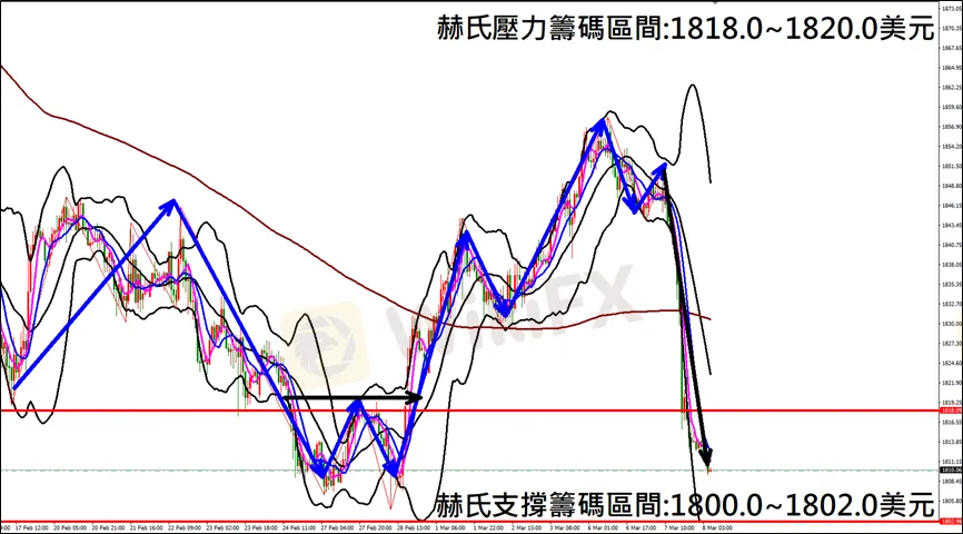 今日(3月8日)黃金早盤在1812.9美元/盎司附近,從技術分析面切入,1小時級別觀察黃金走勢,符合昨日(7日)直播預測K棒重挫下跌,空單獲利入袋,目前K棒呈現空方格局,因此建議外匯市場投資人,今日黃金操作心態以偏空看法為主。