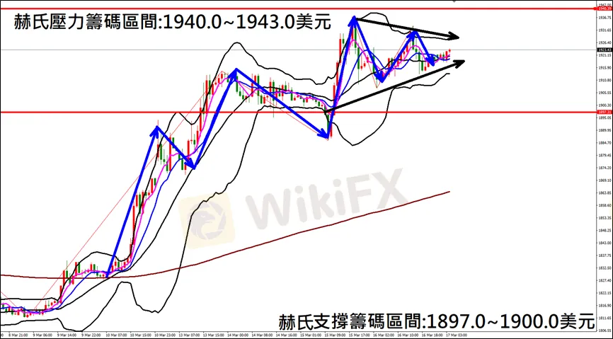 今日(3月17日)黃金早盤在1920.0美元/盎司附近,從技術分析面切入,1小時級別觀察黃金走勢,昨日(16日)K棒持續高點狹幅震盪,目前K棒站穩中軌上方,有望突破下降壓力線後上漲,因此建議外匯市場投資人,今日黃金操作心態以偏多看法為主。