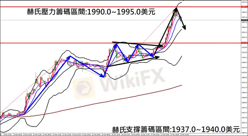 今日(3月20日)黃金早盤在1977.1美元/盎司附近,從技術分析面切入,1小時級別觀察黃金走勢,符合上周五(17日)預測K棒出現暴漲走勢,多單獲利入袋,目前K棒保持多方排列,因此建議外匯市場投資人,今日黃金操作心態以偏多看法為主。