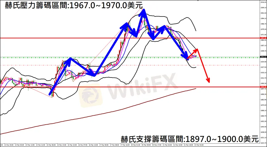 今日(3月22日)黃金早盤在1941.0美元/盎司附近,從技術分析面切入,1小時級別觀察黃金走勢,符合昨日(21日)預測K棒盤中出現大幅修正,空單獲利入袋,目前K棒轉為空方排列,因此建議外匯市場投資人,今日黃金操作心態以偏空看法為主。