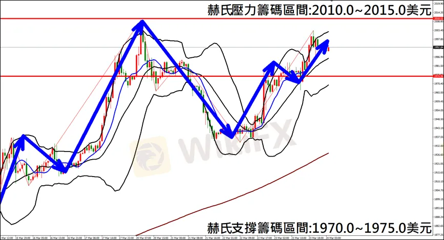 今日(3月24日)黃金早盤在1991.8美元/盎司附近,從技術分析面切入,1小時級別觀察黃金走勢,符合昨日(23日)預測K棒盤中出現反彈行情,多單獲利入袋,目前K棒保持多方排列,因此建議外匯市場投資人,今日黃金操作心態以偏多看法為主。
