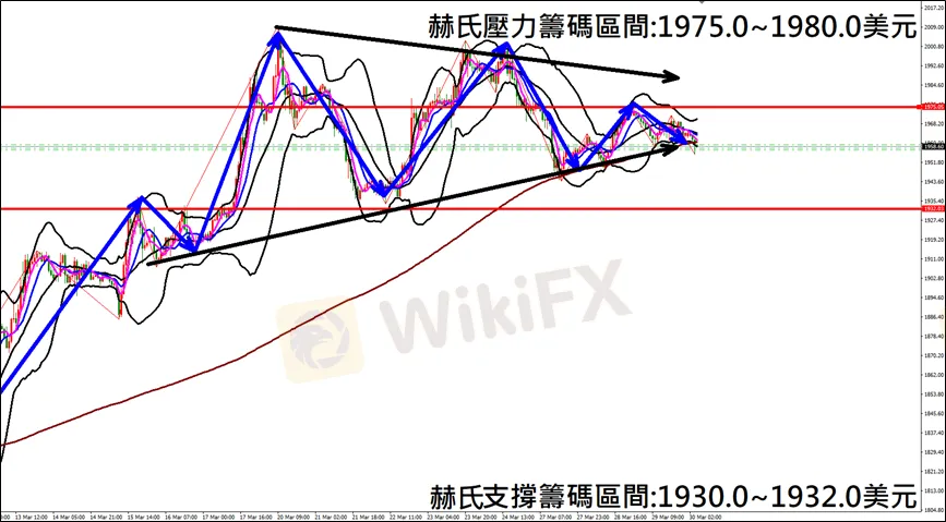 今日(3月30日)黃金早盤在1962.8美元/盎司附近,從技術分析面切入,1小時級別觀察黃金走勢,符合昨日(29日)預測K棒盤中反彈上漲後再度下跌,目前K棒轉為空方型態,同時開口轉折朝下,因此建議外匯市場投資人,今日黃金操作心態以偏空看法為主。