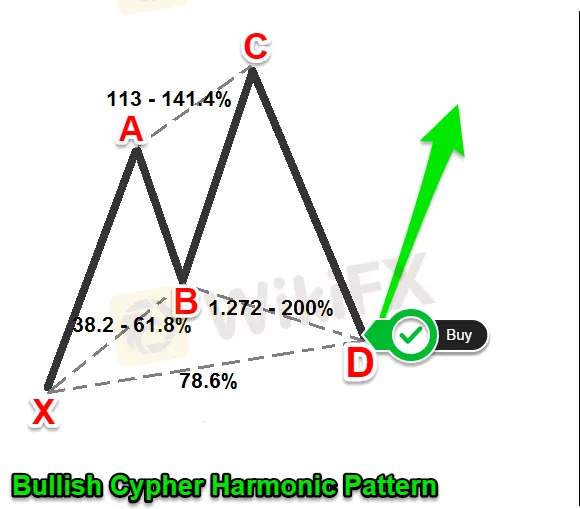 Cypher模式出現的頻率低於其他諧波圖案。這是因為市場價格很難滿足這種剛性斐波那契比率。