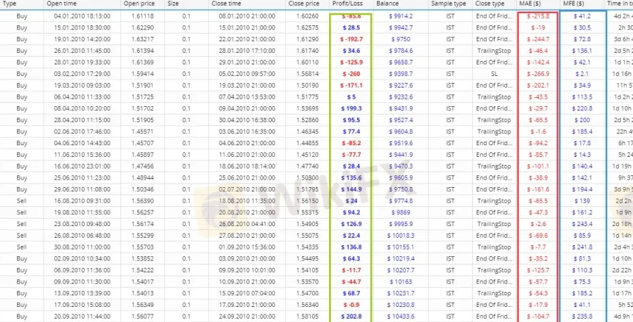 交易統計裡有兩個指標:MAE(下圖紅框)和MFE(下圖藍框),他們分別代表了每筆交易經歷的最大浮虧和最大浮盈利。通過分析最終盈虧(下圖綠框)和MAF和MFE的分佈情況,我們可以瞭解到交易策略的基本思路。