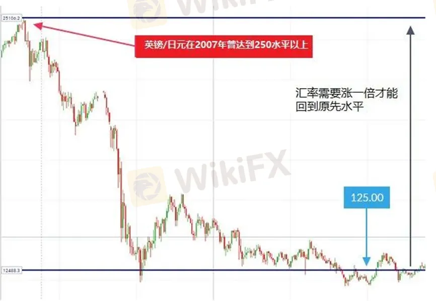 這種想法是極其錯誤的也是極其危險的。就好比英鎊/日元,曾交投於250以上,但之後英鎊/日元匯率僅為124,這幾乎是當初價格的一半!