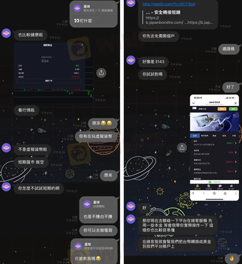 最近就有一位投資人向外匯天眼爆料,他用到一家叫Japan Bond LTD的黑平台,從名字來看應該是假冒日本券商Japan Bond。一開始他是在網路上認識一位女網友,兩人互動還算良好。過了一段時間,對方經常傳自己交易獲利的截圖給受害者,並表示可以帶他一起賺錢。因此,受害者抱著姑且一試的心態下載了APP。