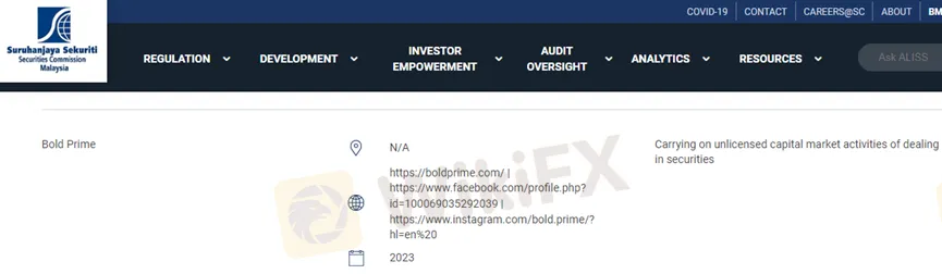 最近,馬來西亞證券委員會(Securities Commission Malaysia)也更新了投資人示警名單,針對Bold Prime發出示警,原因是「進行未經許可的資本市場交易活動」。 馬來西亞SC將持續更新,並鼓勵投資人通報可疑的資本市場活動。