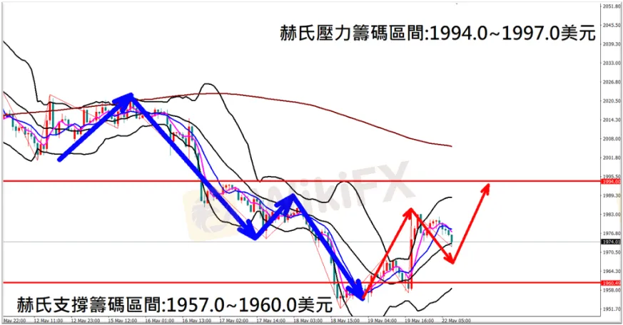 今日(5月22日)黃金早盤在1978.4美元/盎司附近,從技術分析面切入,1小時級別觀察黃金走勢,符合上週五(19日)預測K棒盤中跌深反彈上漲,多單獲利入袋,,目前K棒早盤拉回,有望站穩中軌20MA支撐後再次反彈,因此建議外匯市場投資人,今日黃金操作心態以偏多看法為主。