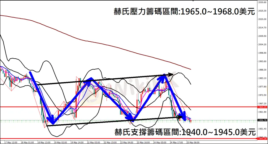 今日(5月25日)黃金早盤在1974.2美元/盎司附近,從技術分析面切入,1小時級別觀察黃金走勢,符合昨日(24日)預測K棒盤中強勢反彈獲利入袋,目前K棒轉為空方排列,有望跌破下方支撐後擴大跌幅,因此建議外匯市場投資人,今日黃金操作心態以偏空看法為主。