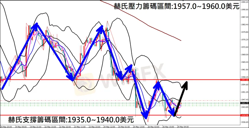 今日(5月29日)黃金早盤在1942.2美元/盎司附近,從技術分析面切入,1小時級別觀察黃金走勢,符合上週五(26日)預測K棒盤持續下跌,目前K棒低點出現轉折訊號,有望形成小W底部型態,因此建議外匯市場投資人,今日黃金操作心態以偏多看法為主。