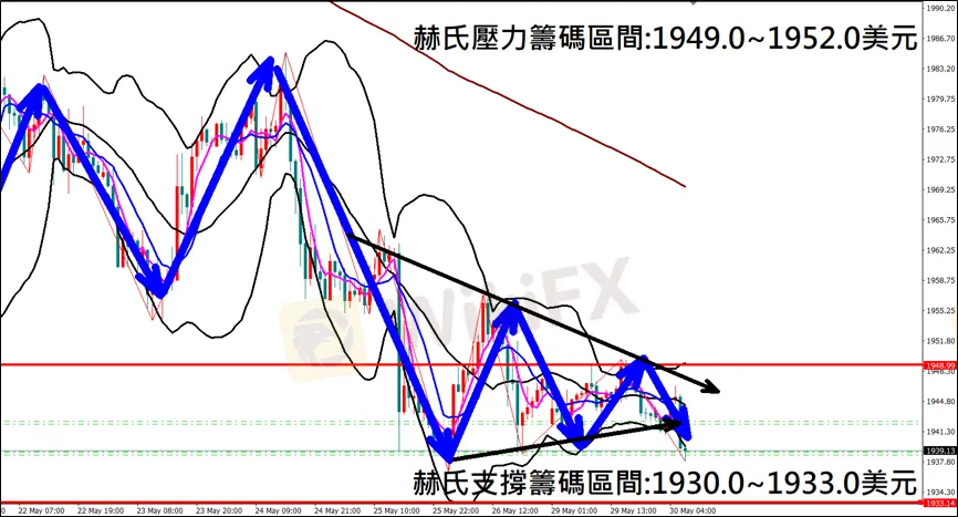 今日(5月30日)黃金早盤在1943.8美元/盎司附近,從技術分析面切入,1小時級別觀察黃金走勢,昨日(29日)K棒盤中小幅反彈後再度轉折下跌,目前K棒出現收斂三角型態,有望跌破支撐持續下跌,因此建議外匯市場投資人,今日黃金操作心態以偏空看法為主。