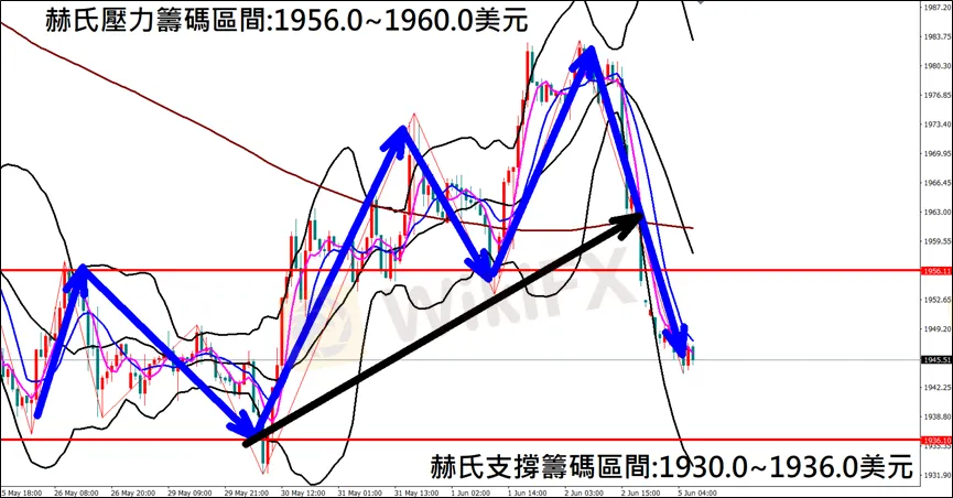 今日(6月5日)黃金早盤在1947.6美元/盎司附近,從技術分析面切入,1小時級別觀察黃金走勢,上週五(2日)K棒盤中受到數據利空影響下重挫下跌,目前K棒轉為空方排列,有望反彈至中軌壓力後再次下跌,因此建議外匯市場投資人,今日黃金操作心態以偏空看法為主。