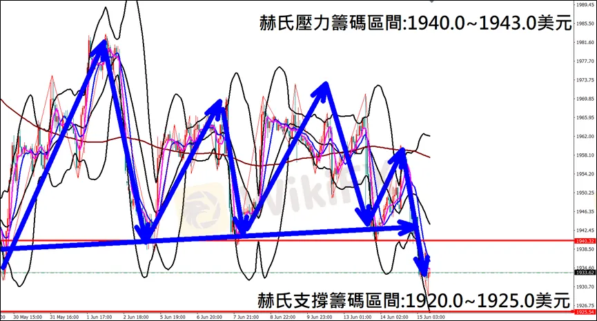 今日(6月15日)黃金早盤在1941.8美元/盎司附近,從技術分析面切入,1小時級別觀察黃金走勢,符合昨日(14日)預測K棒盤中反彈後轉折重挫下跌,空單獲利入袋,目前K棒呈現空方浪型,因此建議外匯市場投資人,今日黃金操作心態以偏空看法為主。