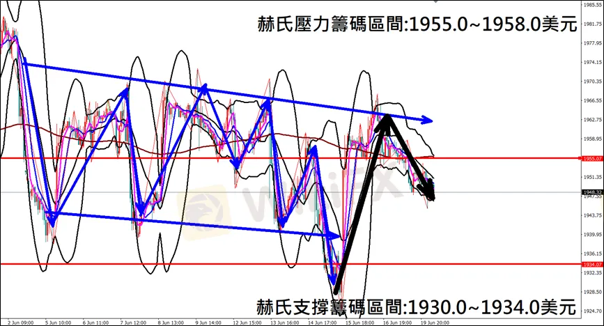 今日(6月20日)黃金早盤在1949.8美元/盎司附近,從技術分析面切入,1小時級別觀察黃金走勢,符合昨日(19日)預測K棒盤中持續下跌,空單獲利入袋,目前K棒保持空方排列,同時布林通道開口朝下,因此建議外匯市場投資人,今日黃金操作心態以偏空看法為主。