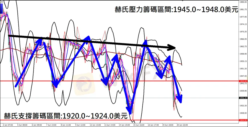 今日(6月21日)黃金早盤在1936.5美元/盎司附近,從技術分析面切入,1小時級別觀察黃金走勢,符合昨日(20日)預測K棒盤中重挫下跌,空單獲利入袋