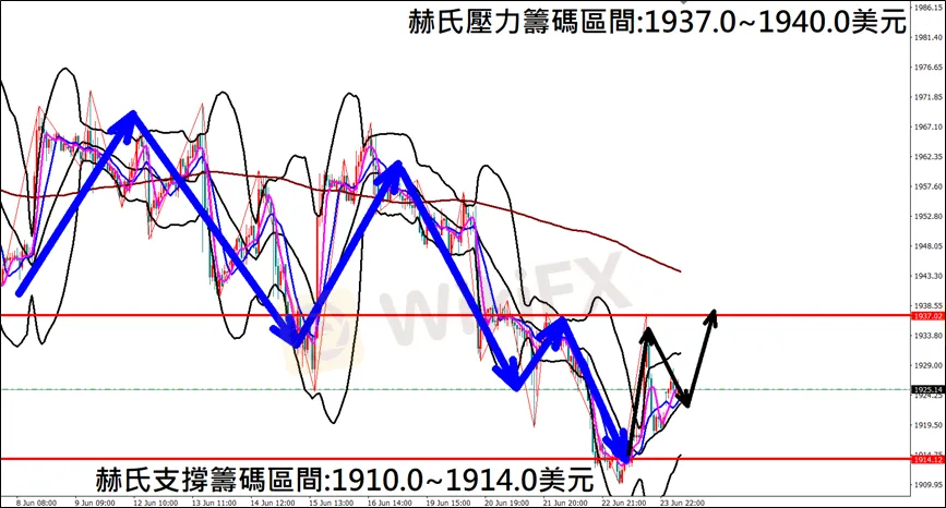 今日(6月26日)黃金早盤在1924.7美元/盎司附近,從技術分析面切入,1小時級別觀察黃金走勢,上週五(23日)預測K棒盤中觸底後反彈上漲,