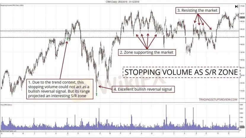 1號止跌成交量信號形成了明顯的支撐位。2號位置信號失敗,3號位置支撐位轉變為阻力位,4號止跌成交量導致行情反轉。