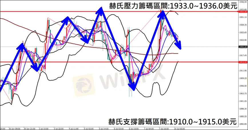 今日(7月10日)黃金早盤在1924.6美元/盎司附近,從技術分析面切入,1小時級別觀察黃金走勢,上週五(7日)K棒盤中受到數據利多影響大幅反彈上漲,目前K棒拉回至布林通道中軌附近,同時開口轉折朝上,因此建議外匯市場投資人,今日黃金操作心態持續以偏多看法為主。